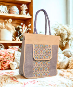 Elegant canvas tote in beige and blue with a floral print front pocket and herringbone side panels — your perfect eco-friendly everyday companion.