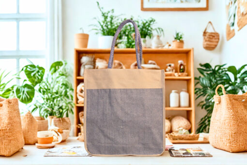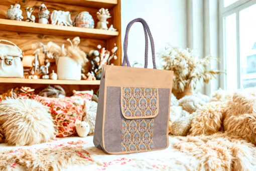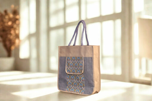 Elegant canvas tote in beige and blue with a floral print front pocket and herringbone side panels — your perfect eco-friendly everyday companion.