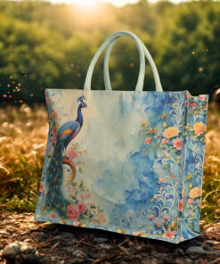 This handcrafted canvas tote bag showcases a majestic peacock surrounded by delicate floral patterns in soft watercolor hues. Perfect for nature lovers and those with an eye for artistic detail, it’s as practical as it is stylish. Carry your world in a bag that speaks of beauty and sustainability.