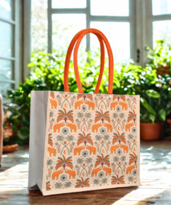 Step out in style with this elegant Heritage Elephant Print Canvas Tote Bag. Made from high-quality, eco-friendly canvas, this bag features a vibrant ethnic-inspired print of orange elephants and palm trees. The bright orange padded handles offer comfort, while the durable material ensures it can hold your essentials with ease. Perfect for daily errands, shopping trips, or as a thoughtful gift.
