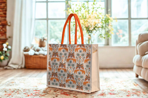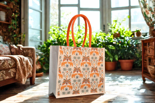Step out in style with this elegant Heritage Elephant Print Canvas Tote Bag. Made from high-quality, eco-friendly canvas, this bag features a vibrant ethnic-inspired print of orange elephants and palm trees. The bright orange padded handles offer comfort, while the durable material ensures it can hold your essentials with ease. Perfect for daily errands, shopping trips, or as a thoughtful gift.