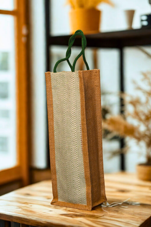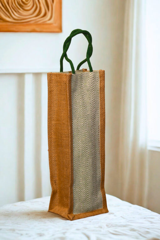 Sleek jute bottle bag featuring a herringbone front panel and strong green braided handles, ideal for gifting or eco-conscious packaging.