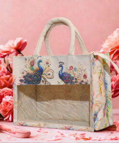 Elegant canvas bag featuring vibrant twin peacocks and floral motifs—ideal for festive gifting, boutique packaging, or eco-friendly giveaways.