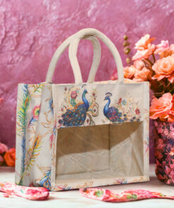 Add a royal touch to your gifting with the Majestic Peacock Canvas Gift Bag. Crafted from durable canvas, this bag features a stunning illustration of twin peacocks surrounded by colorful floral artwork. A transparent PVC window adds a practical view into the contents, while the thick rope handles provide comfort and style.