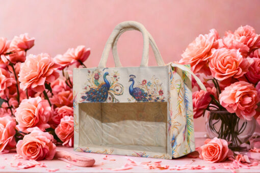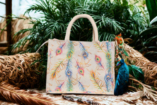 Elegant canvas bag featuring vibrant twin peacocks and floral motifs—ideal for festive gifting, boutique packaging, or eco-friendly giveaways.