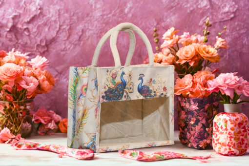 Add a royal touch to your gifting with the Majestic Peacock Canvas Gift Bag. Crafted from durable canvas, this bag features a stunning illustration of twin peacocks surrounded by colorful floral artwork. A transparent PVC window adds a practical view into the contents, while the thick rope handles provide comfort and style.