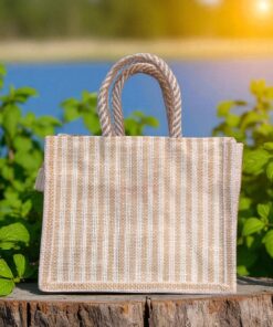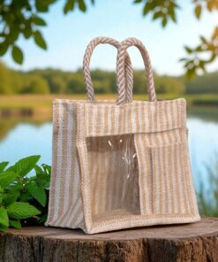 Eco-friendly striped jute gift bag with transparent front window, dual compartments, and sturdy rope handles – ideal for gifting bottles, jars, or hampers.