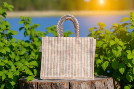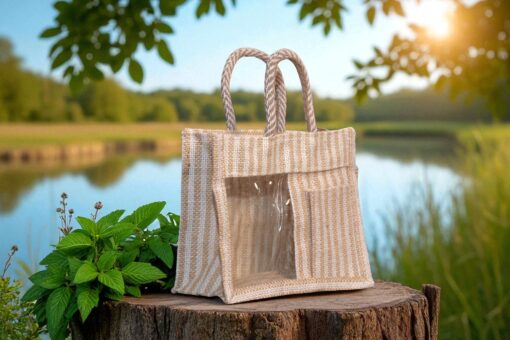 Eco-friendly striped jute gift bag with transparent front window, dual compartments, and sturdy rope handles – ideal for gifting bottles, jars, or hampers.