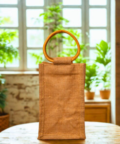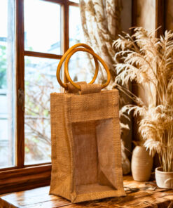 Elegant single-bottle gift bag made from natural jute with a transparent front panel and sturdy wooden ring handle. Ideal for wine bottles or eco-friendly gifting.
