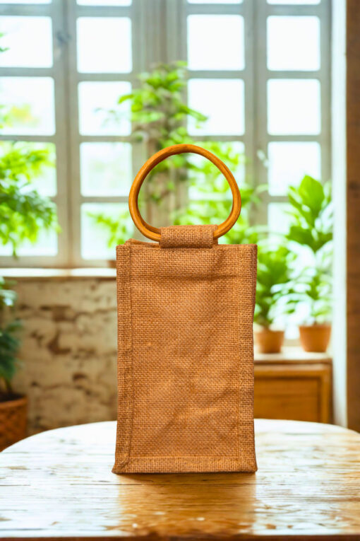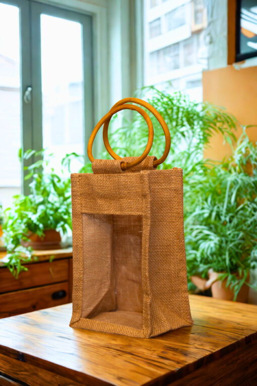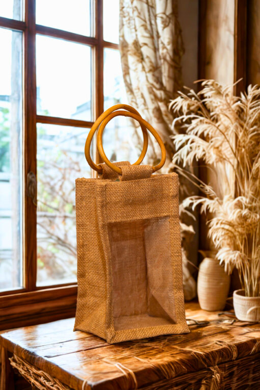 Elegant single-bottle gift bag made from natural jute with a transparent front panel and sturdy wooden ring handle. Ideal for wine bottles or eco-friendly gifting.