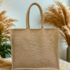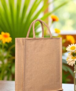 Reusable 12"x14" vertical juco tote bag with soft padded handles, perfect for shopping, errands, and daily use.