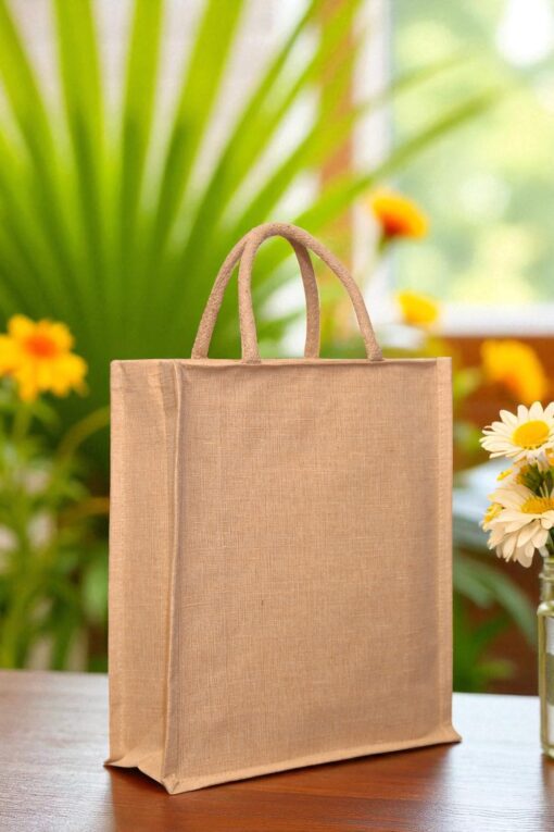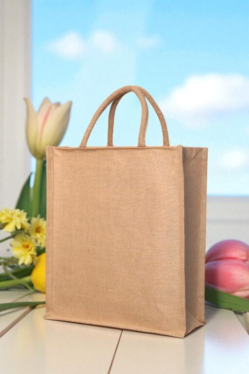 Reusable 12"x14" vertical juco tote bag with soft padded handles, perfect for shopping, errands, and daily use.