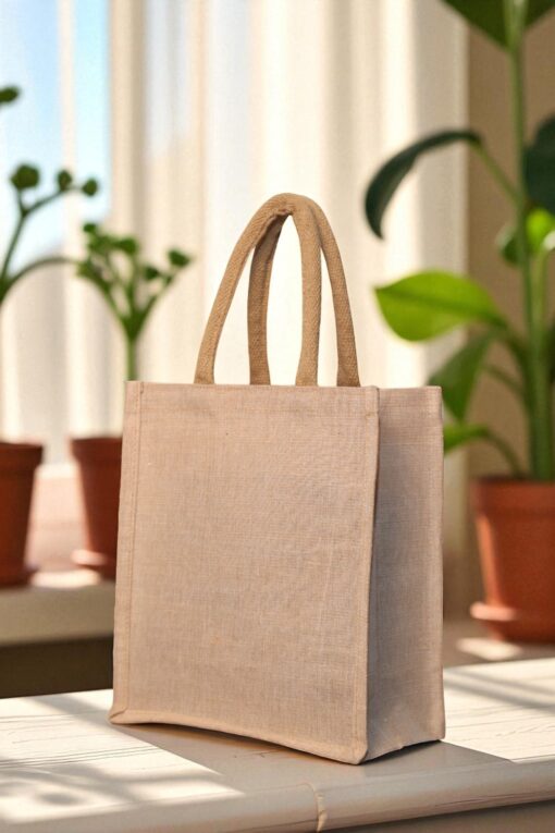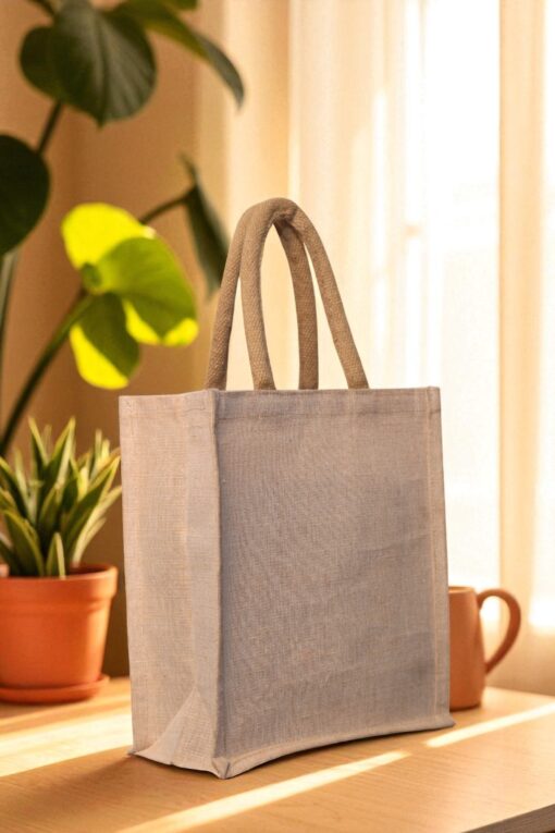 Small eco-friendly juco tote bag with padded handles and minimalist design—perfect for daily carry or gifting.