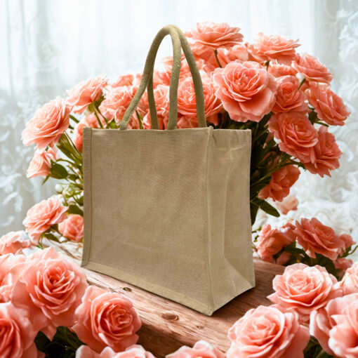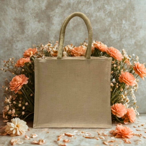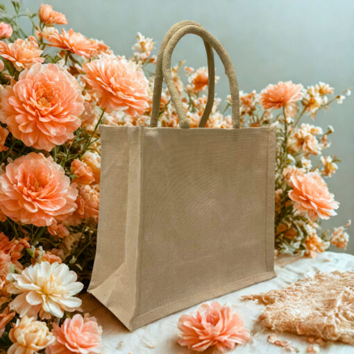 Square-shaped eco tote bag made of natural jute with padded handles—ideal for sustainable everyday use.